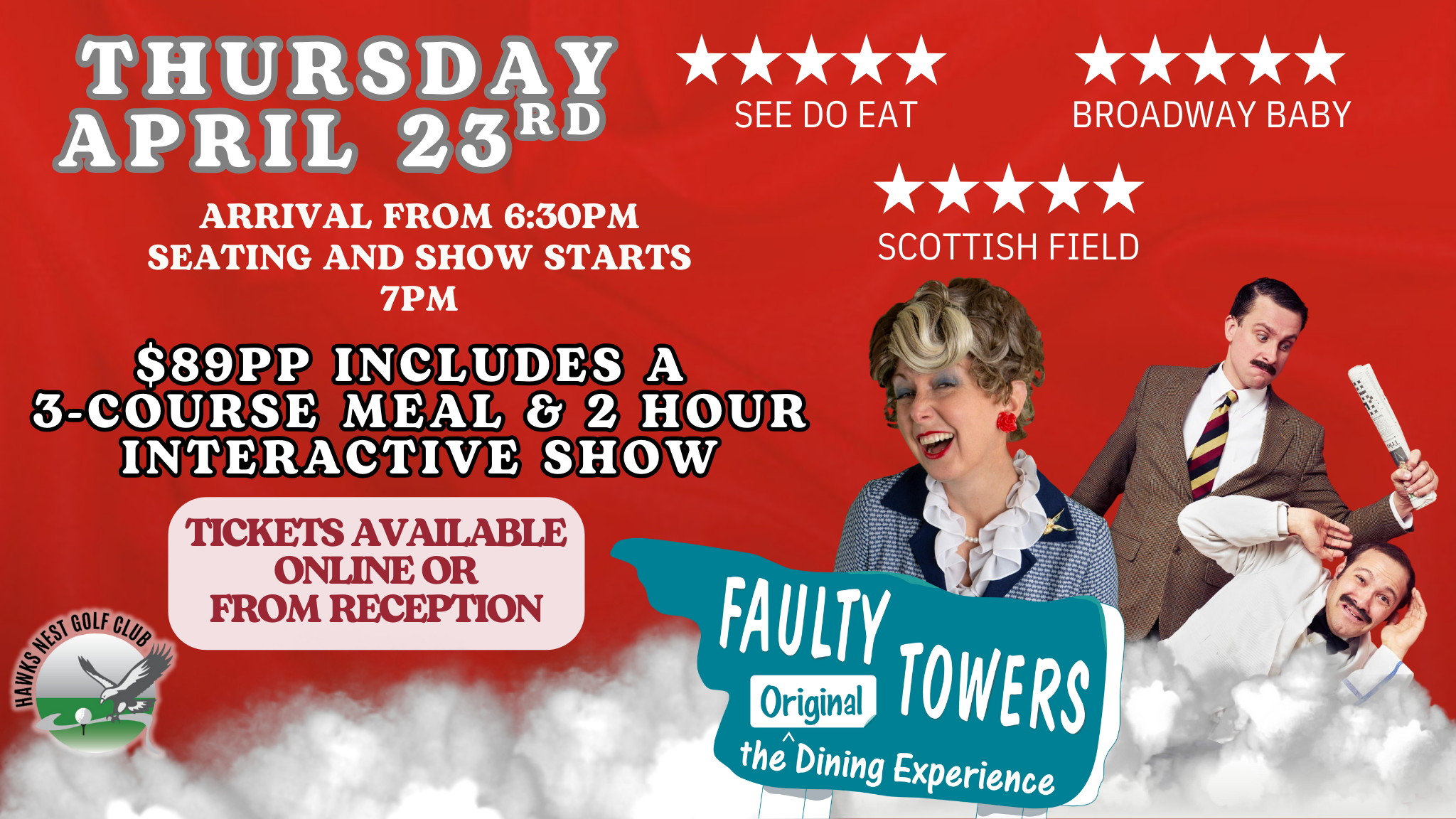 Thursday April 23rd - arrival at 6.30pm for a 7pm seating and show commencement.